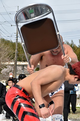 岡田が向かって行くと樋口は胸板にチョップ(左写真)。寒いとチョップが効くらしい。