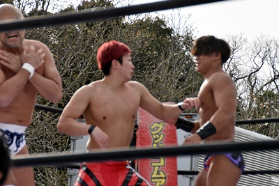 樋口楽しそうに秋山を自軍コーナーに連れ帰り(右写真)、岡谷にタッチ。岡谷もかつての師匠・秋山の背中にチョップ。