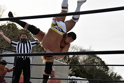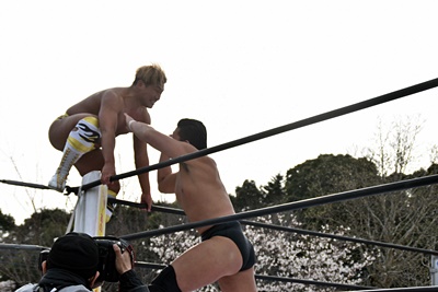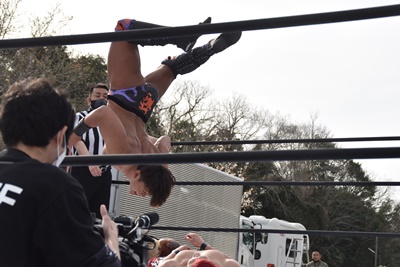 秋山は岡谷を場外(シートの下は砂利)でボディスラム(右写真)。