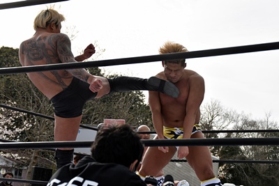 岡田串刺しエルボー連打、ブレーンバスター狙う、樋口が逆に持ち上げるが岡田着地して低空ドロップキック(右写真)。10分経過。