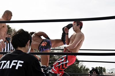 岡谷ロープに飛ぶ、遠藤カウンターのトラースキック(右写真)、