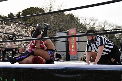 片エビ固めで(左写真)カウント3。