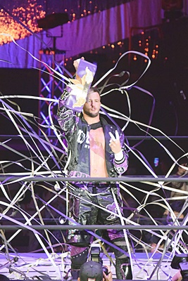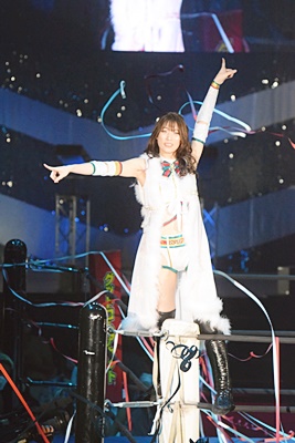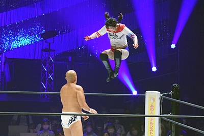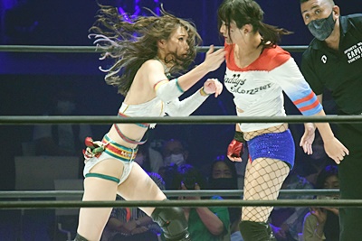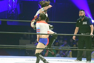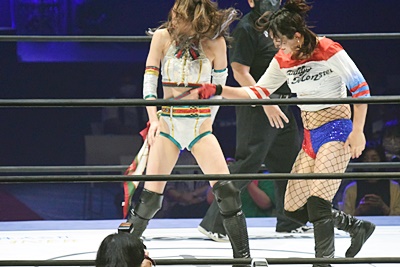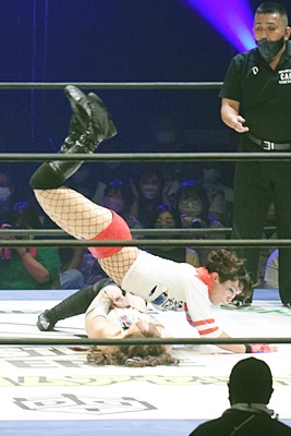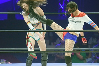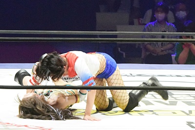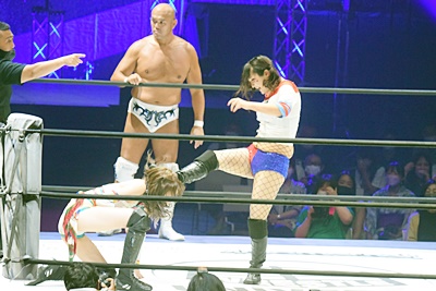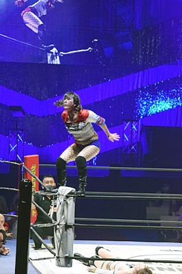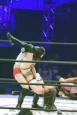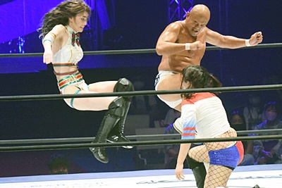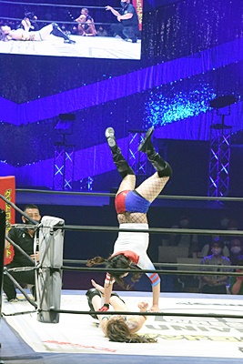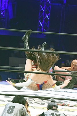 秋山クリスをコーナーに振って突っ込む、クリスカウンターのキック、セカンドコーナーから秋山の背中にダイビングセントーン(左写真)、朱崇花にタッチ。