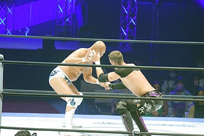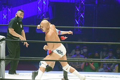 ロープに飛ぶ、秋山カウンターのラリアット(左写真)。赤井にタッチ。