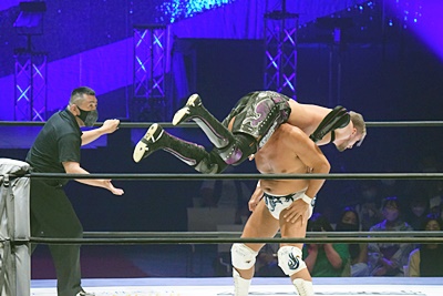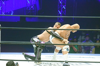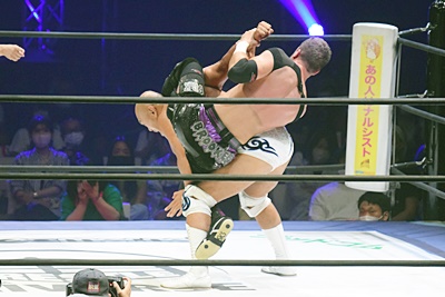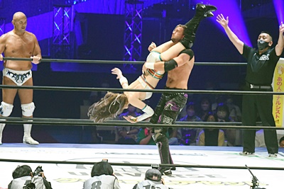 秋山場外パイルドライバー狙うがクリスが救出(右写真)。秋山は赤井にタッチ。