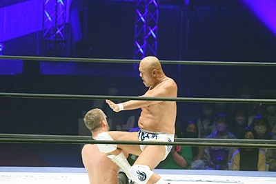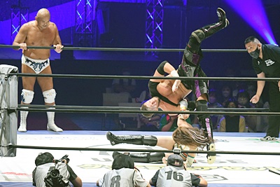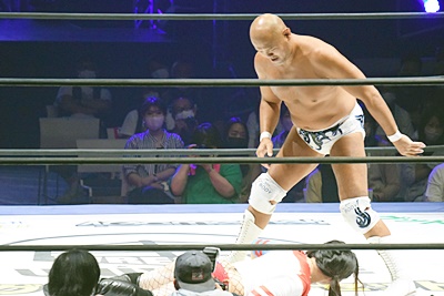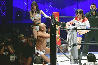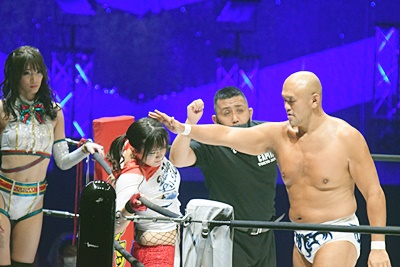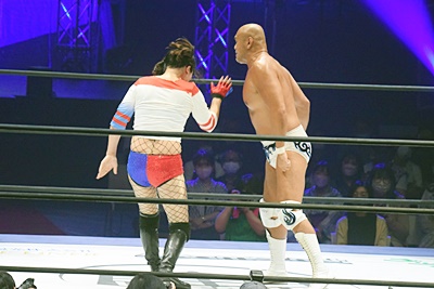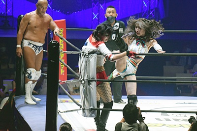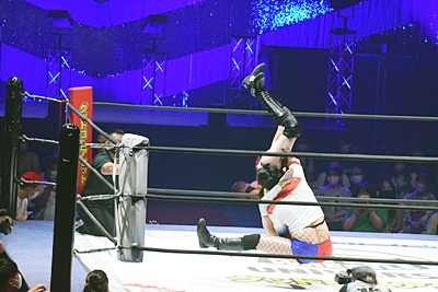 秋山が追いかけると朱崇花リングに戻ってビッグブーツ、秋山を場外に落とす(右写真)。