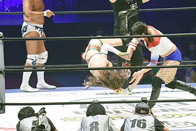 朱崇花エルボー(右写真)、ダウンした赤井を踏みつけてフォール、カウント2。クリスにタッチ。
