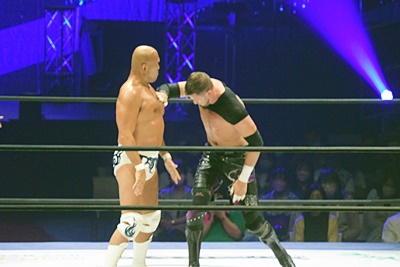 赤井も立ち上がってビッグブーツ打ち返す(右写真)。