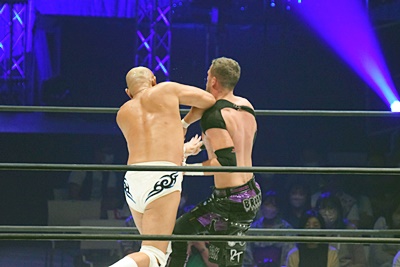 コーナーに追い込んで串刺しビッグブーツ(左写真)。10分経過。