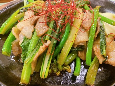 このアスパラの葉の炒め物がうまかった。添えられたレモンマヨネーズがよい。どこで売ってるんだろう?