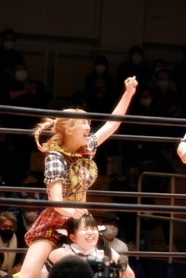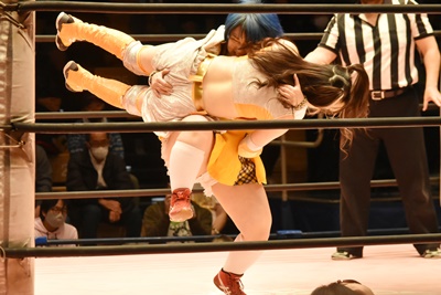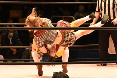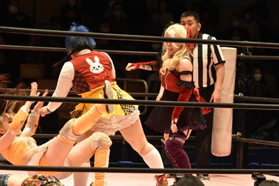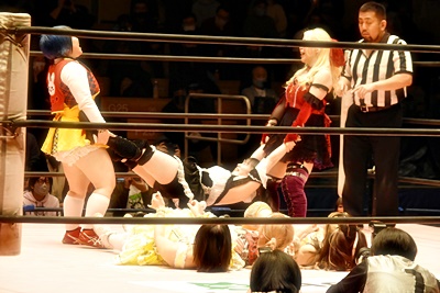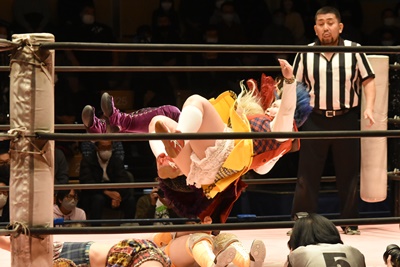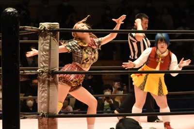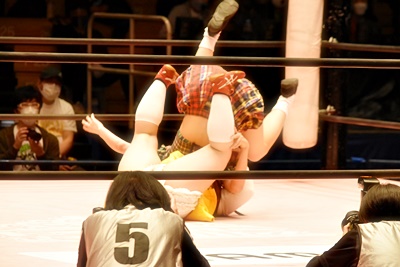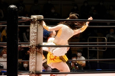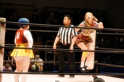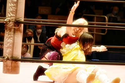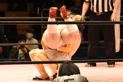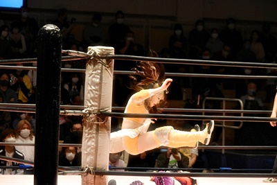 ユキサイドスープレックス狙う、らくブロックしてコーナーに振る、ユキ切り返す、らくコーナーに飛び乗ってダイビング脳天チョップ(右写真)、マリカにタッチ。
