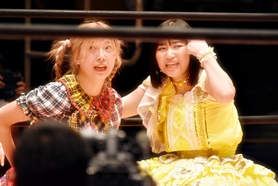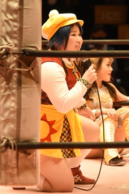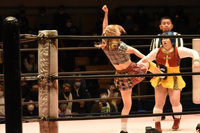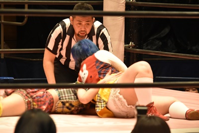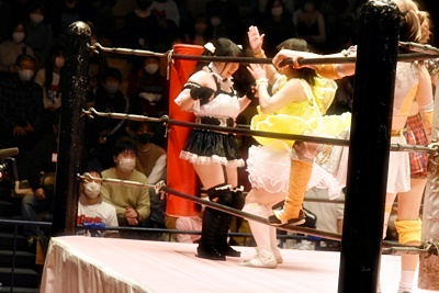 ぽむコーナーに振る、のどか切り返して突っ込む、らくがエプロンから脳天チョップ、ロープを使ってのネックブリーカー。ぽむがコーナーに上ってミサイルキック(左写真)。