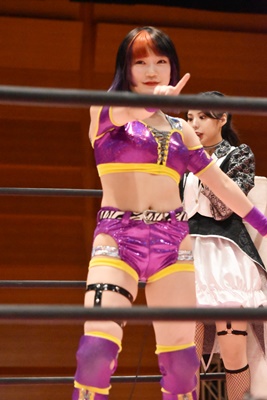 荒井鈴芽のドロップキックをかわしてエルボー、鈴芽をコーナーに振って突っ込む、鈴芽かわす。有栖が入って串刺しエルボー(左写真)、