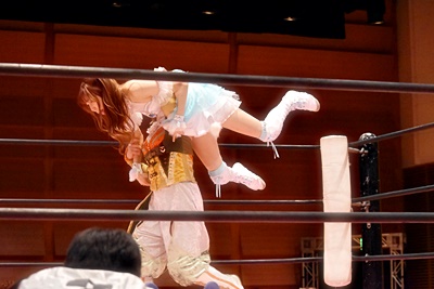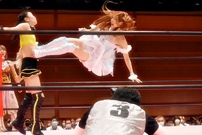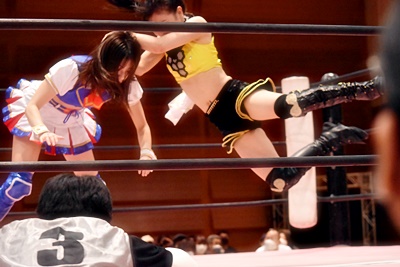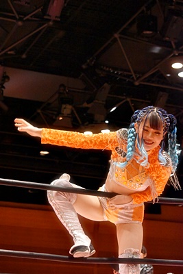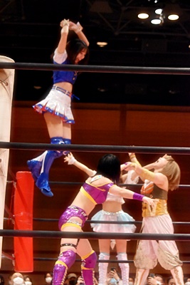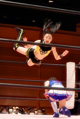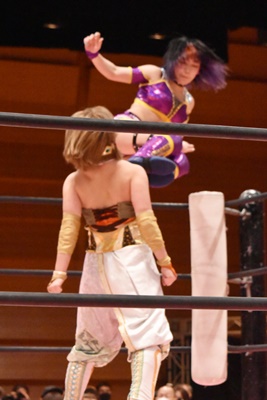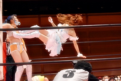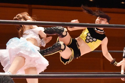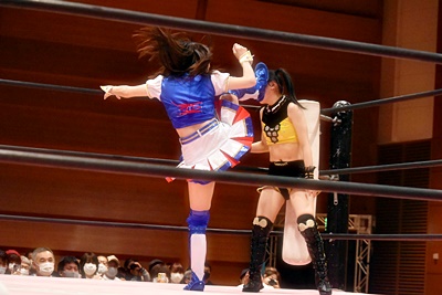 ユカッチマリカをロープに振ってバックエルボー、コーナーに振ってジャンピングハイキック(右写真)。