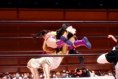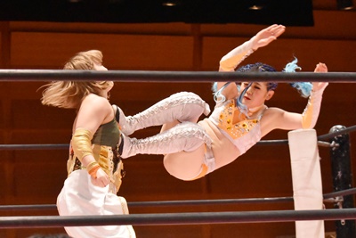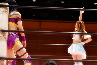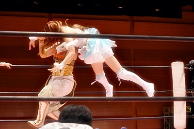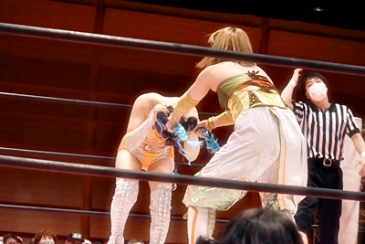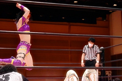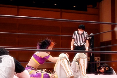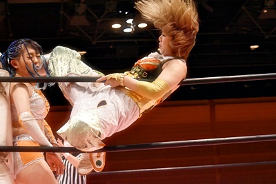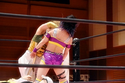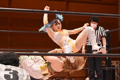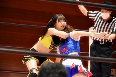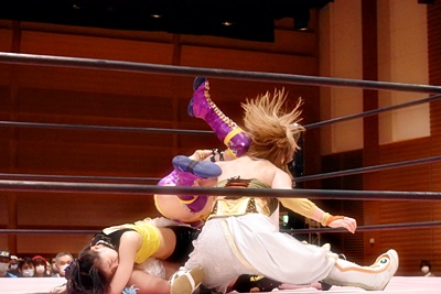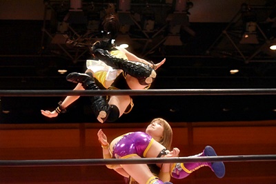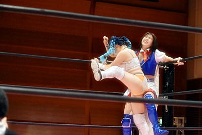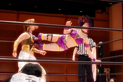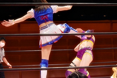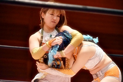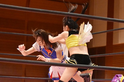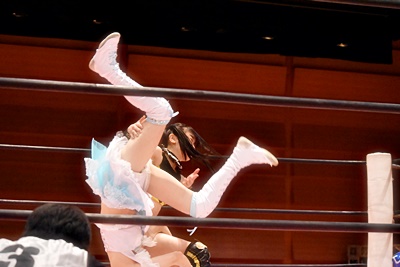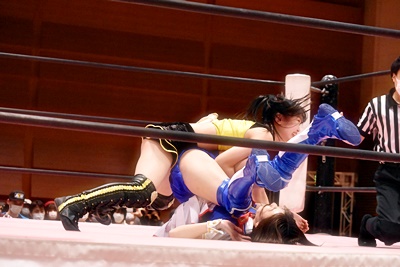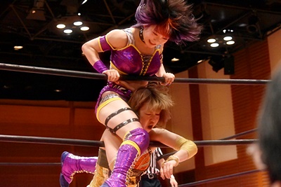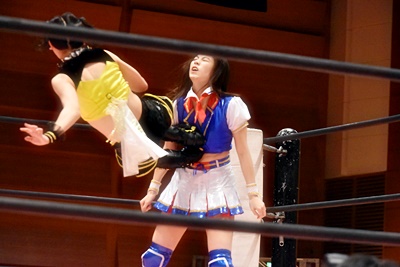 ユカッチスライディングラリアット、マリカかわしてジャンピングレッグドロップ(右写真)、フロントネックロックに。
