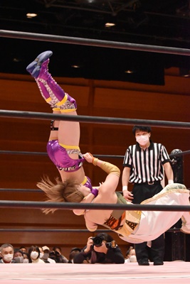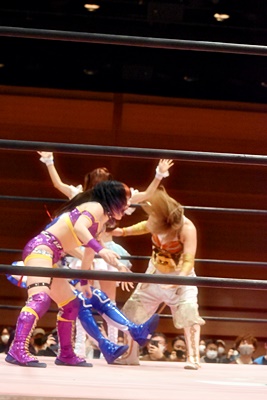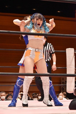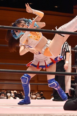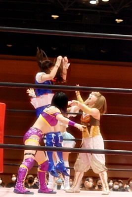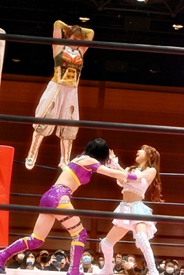 荒井ドロップキック、フルネルソンバスター狙うが鈴芽はブロックして飛びつきフェースクラッシャー(右写真)、マリカにタッチ。