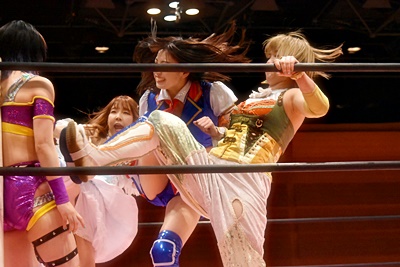 マリカ着地してドロップキック(右写真)、有栖にタッチ。