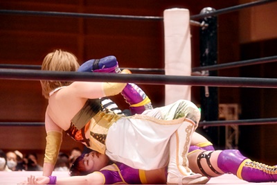 カバーに来た有栖をユカッチは首投げからグラウンドヘッドロックに(左写真)。