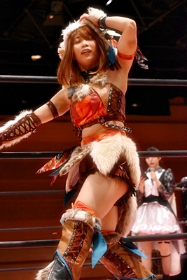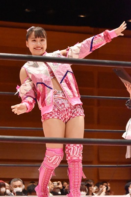 辰巳リカはいつもの入場ルーティンから山下の決めポーズ(左写真)。