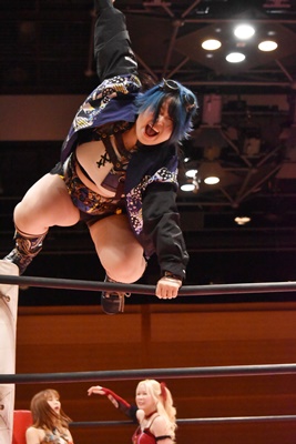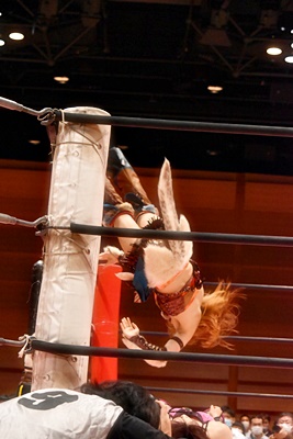 キルスイッチ(左写真)、リカも場外に。中島が追撃のトペ・スイシーダ。