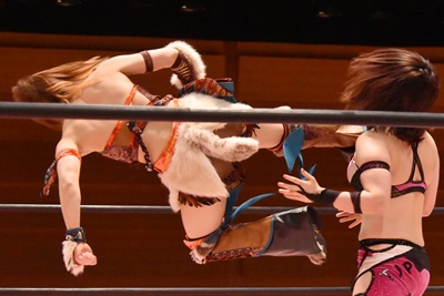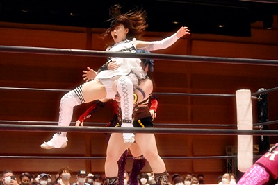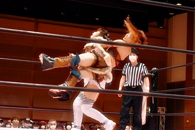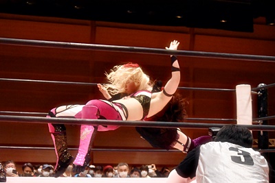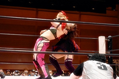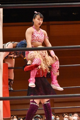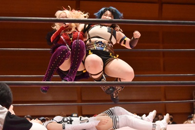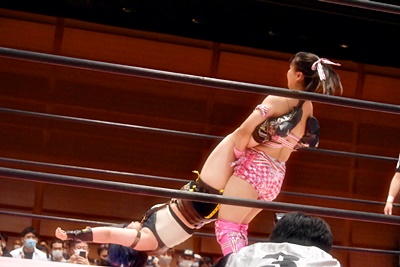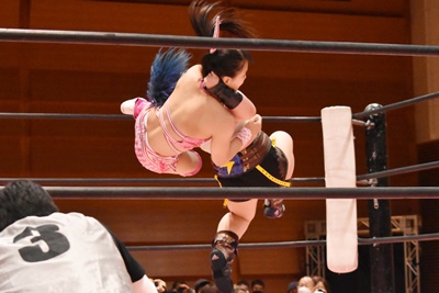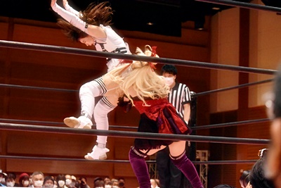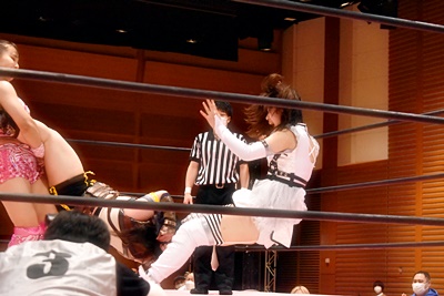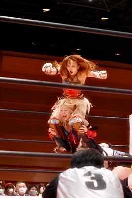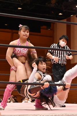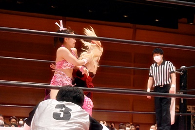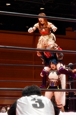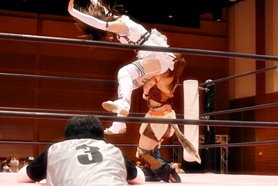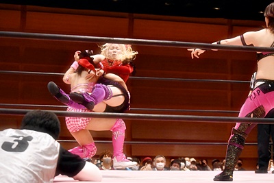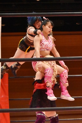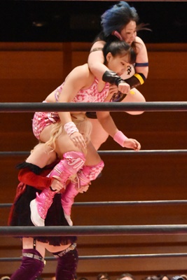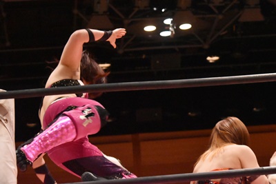 ユキがリカをコーナーに振って突っ込む、リカはカウンターのジャンピングヒップアタック(左写真)、未詩にタッチ。