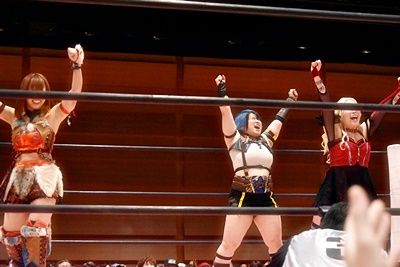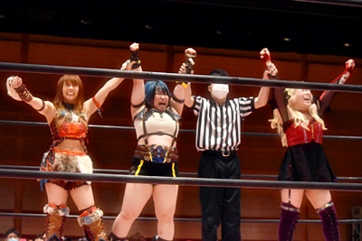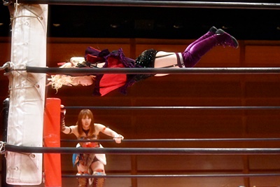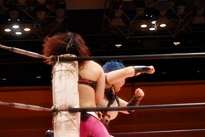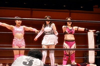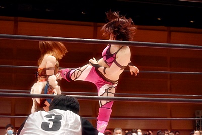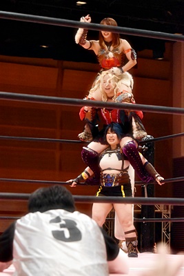 山下をコーナーに振って東女特撮部3人連続の串刺し攻撃(右写真)。