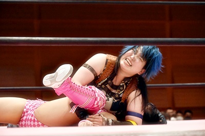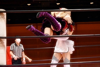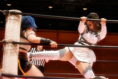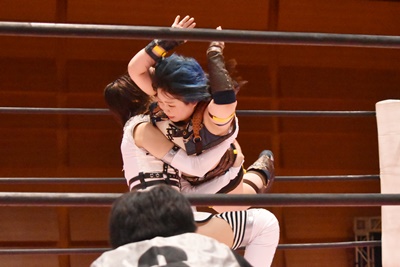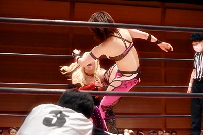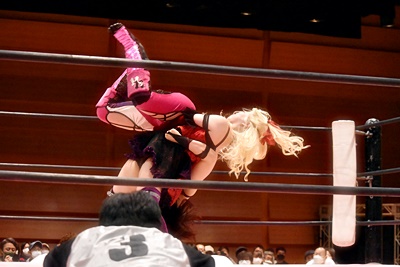 ユキはキックをブロックしてサイドスープレックス(右写真)、中島にタッチ。10分経過。