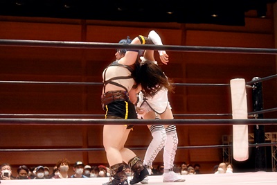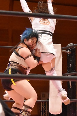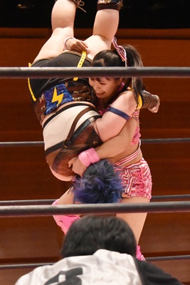 場外に出た中島を未詩がベアハッグに捕らえる(左写真)。