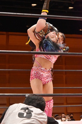 未詩ジャイアントスイングの体勢、のどかはサードロープをつかんで抵抗(右写真)、