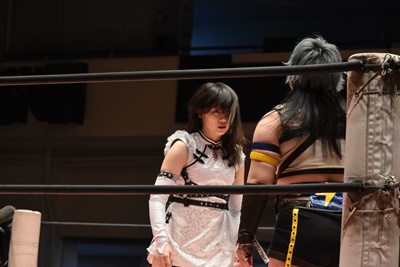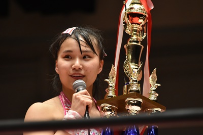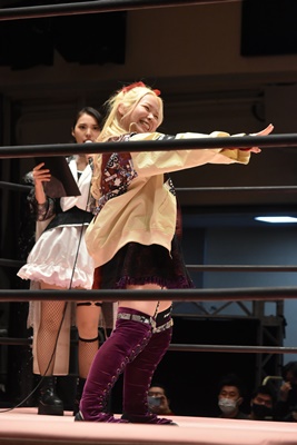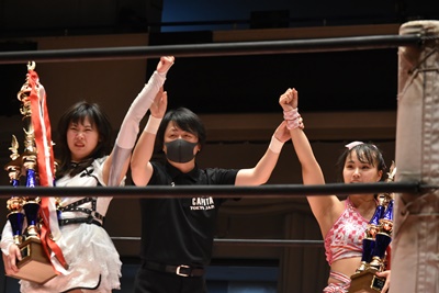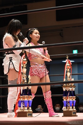 未詩「今日は、世の中こんな状況の中、こんなたくさんの人、そしてYouTube、Abema、WRESTLE UNIVERSEを見てる人が応援してくださったから、今こうやってトロフィーも手にできてるし、さらにマジラビとの闘いも決まったので、両国に向けて突っ走って行きたいですね。」(右写真)