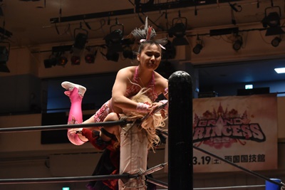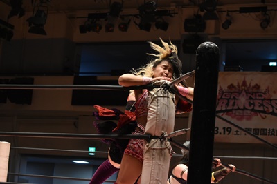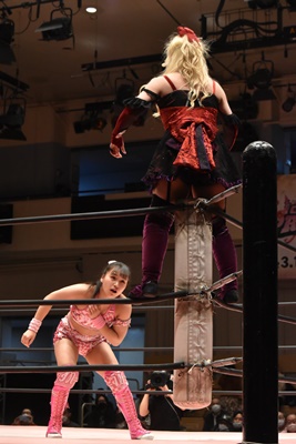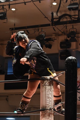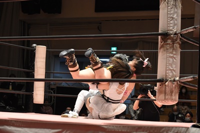 ユキボディスラム、リバーススプラッシュ、カウント2。フルネルソン、未詩立ち上がってユキをコーナーに振る、未詩突っ込む、ユキカウンターのバックエルボー。ユキコーナーに上って(右写真)、