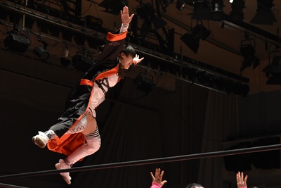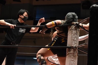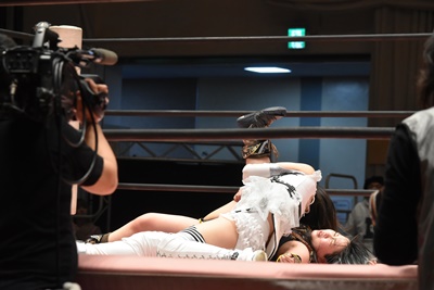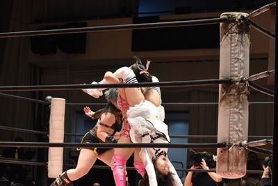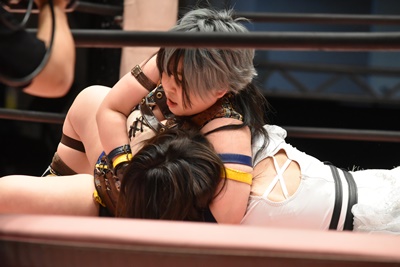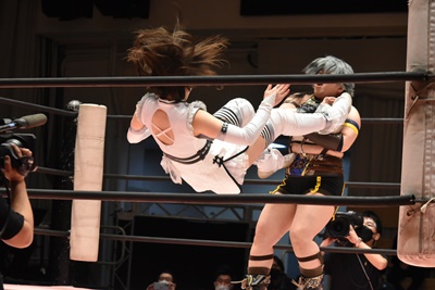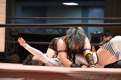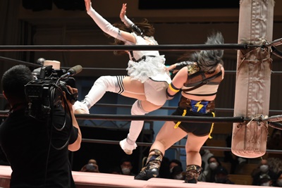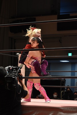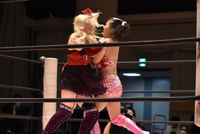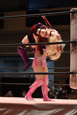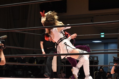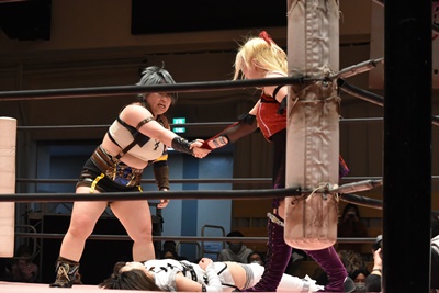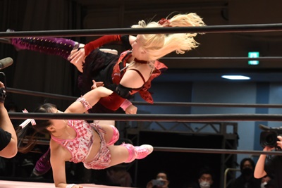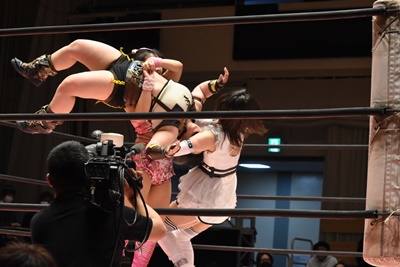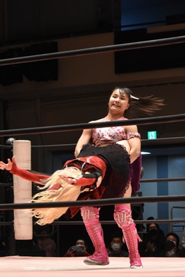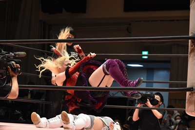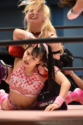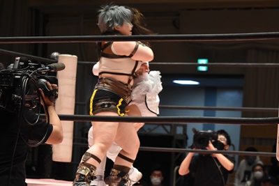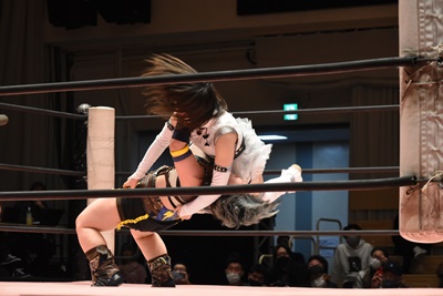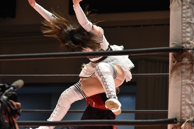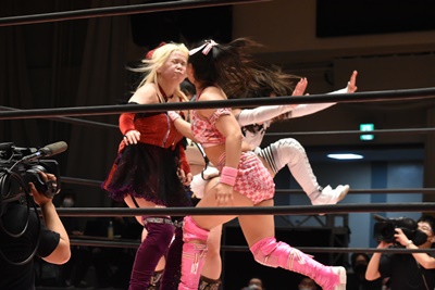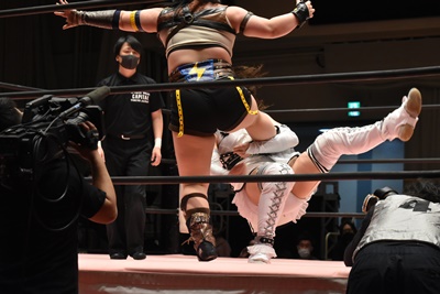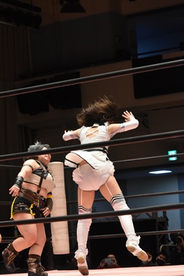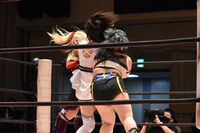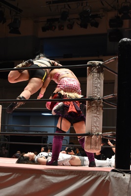 ユキの頭をエプロンに出し、リカが場外を走ってジャンピングヒップアタック。リカリングに戻ってカバー、カウント2。ユキ足4の字をブロックし立ち上がるとフライングショルダーアタック(左写真)、のどかにタッチ。