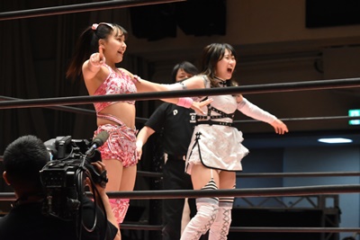 リカ「いつか、そのタッグのベルトを懸けて、マジラビと闘いたいってずっと思ってた。今私たちにはその権利があると思います。だから、夢の舞台の両国国技館で、ベルトを懸けて、闘ってください。」と挑戦意思表明(左写真)。