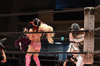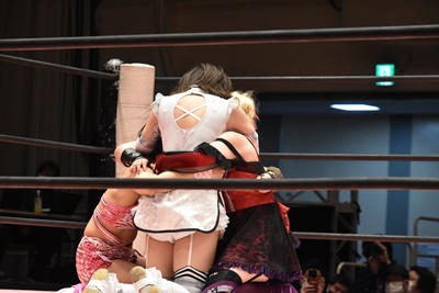ユキUBV狙う、未詩ブロック。ユキロープに飛ぶ、未詩すくい上げてアバランシュホールド(左写真)、リカにタッチ。
