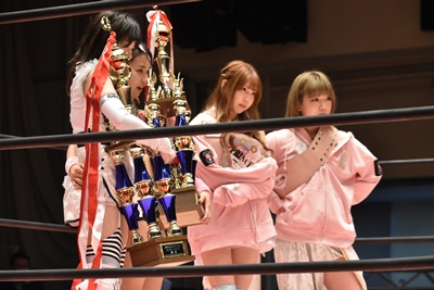 リカが「このトロフィーは2人で勝ち取りました。でも、私たちには、まだ叶えたい夢があります。」と現プリンセスタッグ王者のマジラビを呼び出す(右写真)。