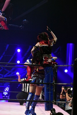 伊藤コーナーに上ってスイングDDTの体勢(左写真)、