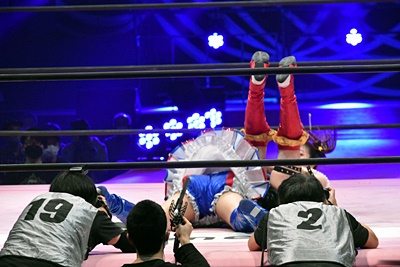 伊藤コーナーに上る、荒井下からビッグブーツ(左写真)、エプロン場外に。