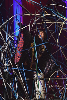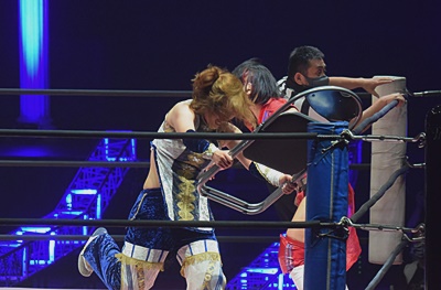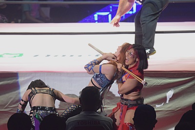 志田とヒカリは東洋盟友を場外に出し、リングサイドに寝せた真弥(見えない)の上に置いたイスにかみーゆを座らせ、志田が竹刀で首絞める(右写真)。