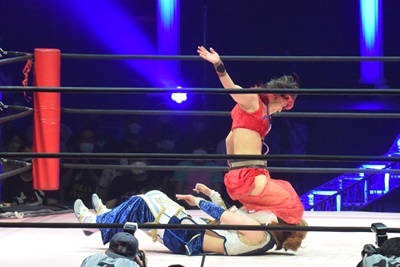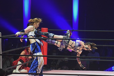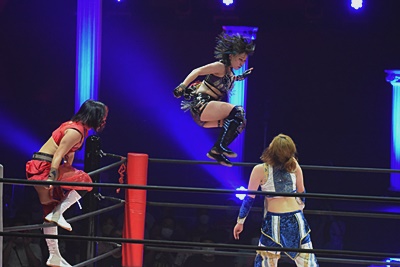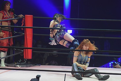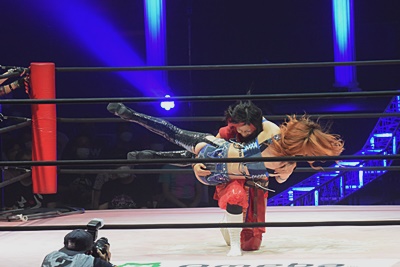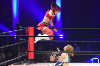 かみーゆ志田をコーナーに上げてドロップキック(左写真)。