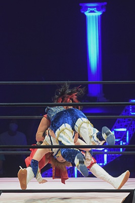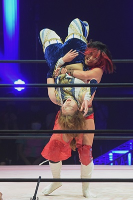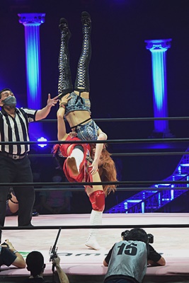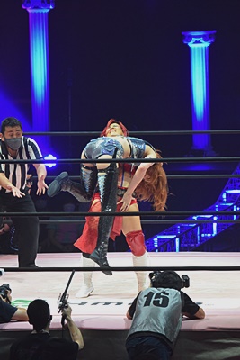 かみーゆブレーンバスター狙うが志田ブロック、逆に持ち上げ(右写真)、