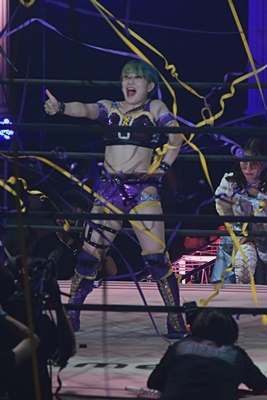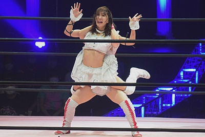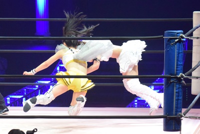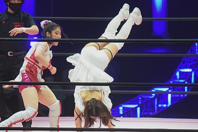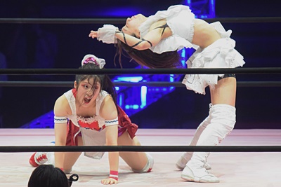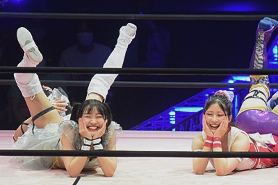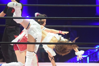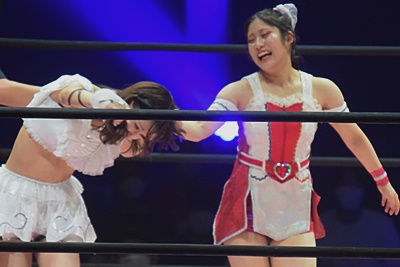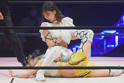 ダブルのあざと可愛いポーズ(左写真)でフォール、カウントは2。