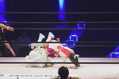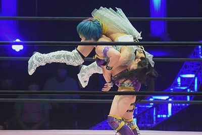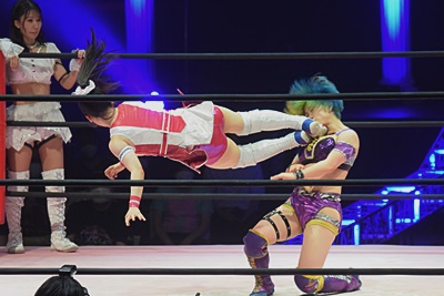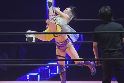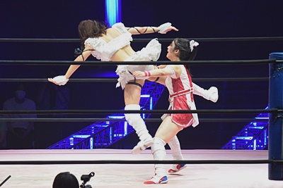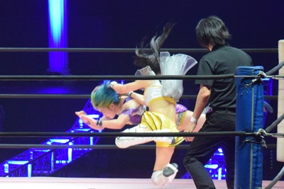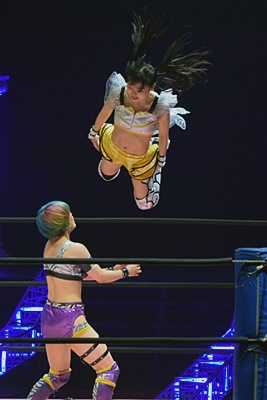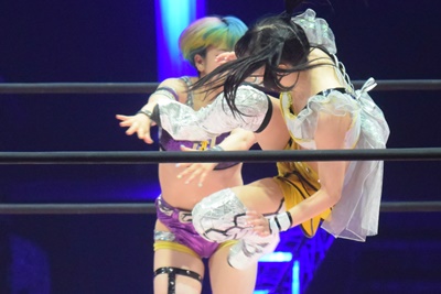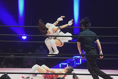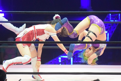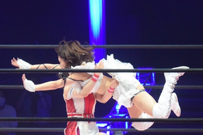 カットに入ったメイに里歩がダイビングクロスボディ(左写真)、