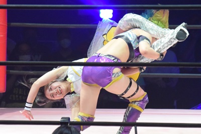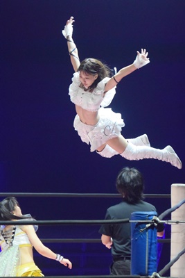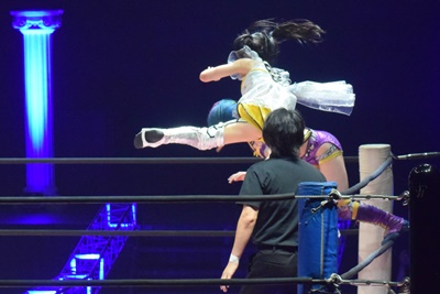 鈴芽リング・ア・ベル狙うが里歩ブロック。コーナーに上るとダイビングクロスボディ(右写真)、