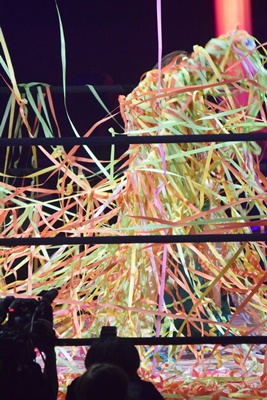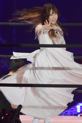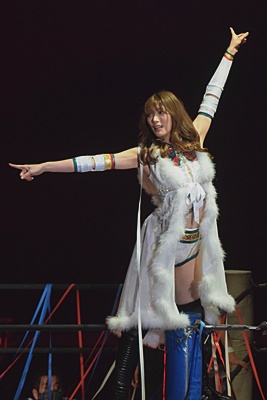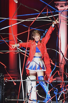 荒井優希コーナーに上って赤井沙希の入場ポーズ。紙テープに驚く(左写真)。