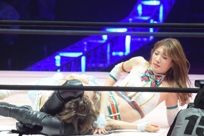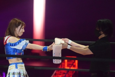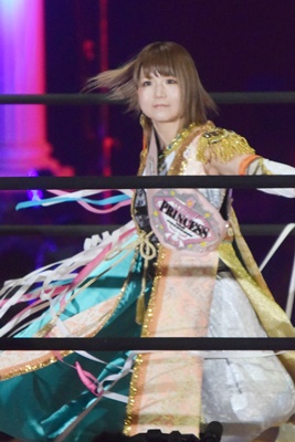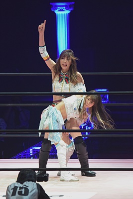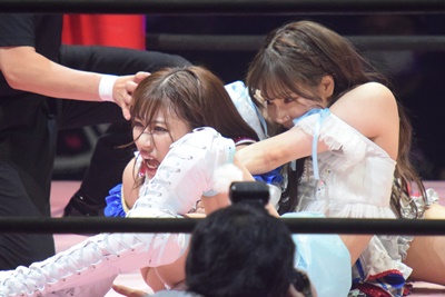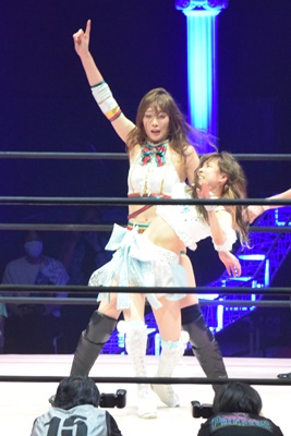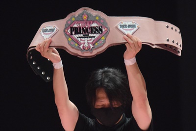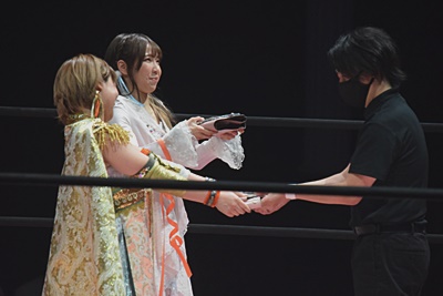 木曽レフェリーがプリンセスタッグのベルトを掲げる(右写真)。