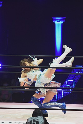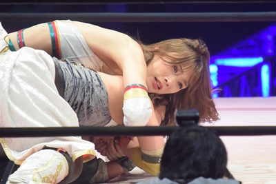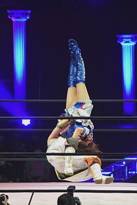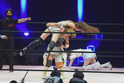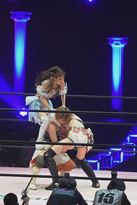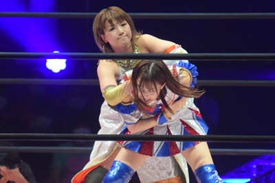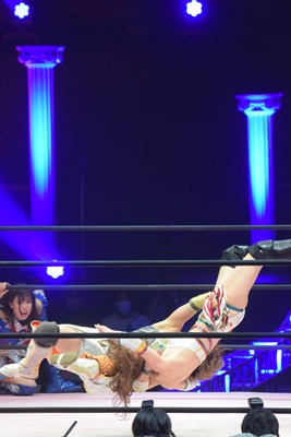 ユカッチ入って赤井にブレーンバスター狙う、赤井ブロック、みずぴょんがユカッチの背中に駆け上り(右写真)、