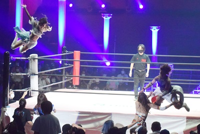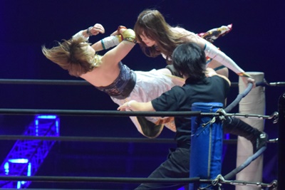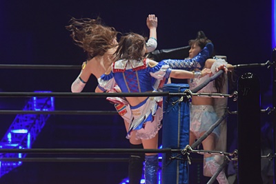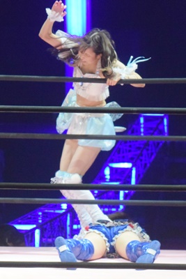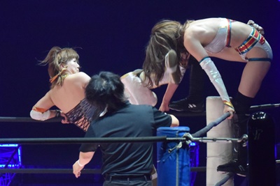 みずぴょんショルダースルーで赤井をエプロンに出すとロープの間からクロスボディを浴びせ赤井を場外に(右写真)。ユカッチもドロップキックで荒井を場外に落とす。