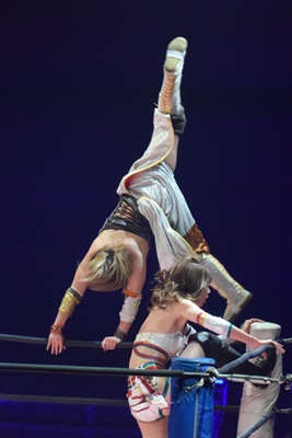 ユカッチコーナーに上る、赤井ビッグブーツ、ユカッチ側転でかわす(左写真)。