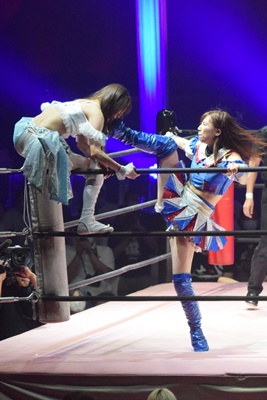赤井みずぴょんの手をつかんでキック連打(左写真)、