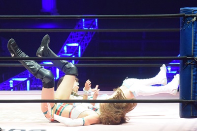 荒井がみずぴょんをフルネルソンバスター、赤井がユカッチをブレーンバスターに(右写真)。